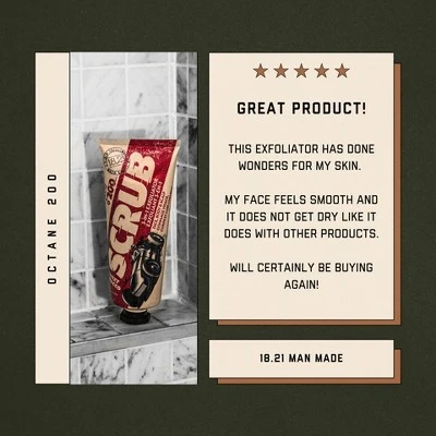 The Godfather of Grooming.18.21 Man Madeâ„¢ 3-in-1 Face, Body and Scalp Scrub is your all-in-one upgrade for smoother skin and a cleaner, healthier scalp. Powered by natural exfoliants and rich moisturizers, this multitasking scrub sloughs away dirt, flakes, and buildup—leaving you polished from head to toe. Whether you’re tackling dry elbows, greasy skin, or clogged follicles, this formula gets the job done without over-drying.Scent: Sweet TobaccoA bold, charismatic fragrance with notes of saffron, dark-toned vanilla, golden honey, and tobacco leaf—smooth, warm, and unforgettable.