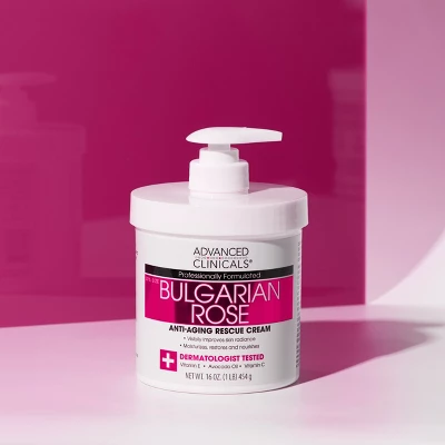 Advanced Clinicals Bulgarian Rose Anti-Aging Rescue Cream is formulated to moisturize, nourish, and restore dry skin. This concentrated hydrating cream is infused with natural Bulgarian Rose to promote a supple and lifted appearance. Replenishes moisture to dry skin with Vitamin E and Avocado Oil. Features rare, anti-aging Rose extracts from the Kazanlika Valley of the Roses in Bulgaria. Especially helpful for smoothing the appearance of neck and chest creases. Our refreshing and hydrating cream goes on smooth and absorbs quickly, instantly improving skin radiance. test