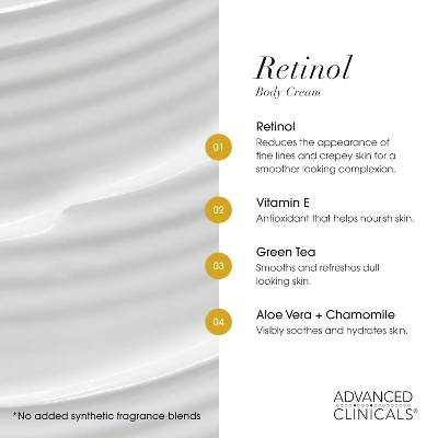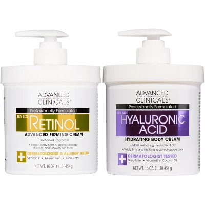 Hyaluronic Acid Instant Skin Hydrator is formulated to restore volume to sagging skin while locking in moisture for a younger looking appearance. Enhanced with Borage Oil, Squalene , and Vitamin E, these beneficial ingredients contain restorative properties that truly transform your complexion. Increase the water retention in your skin to reduce the appearance of wrinkles and fine lines for a flawless complexion.Retinol Advanced Firming Cream reduces the visible signs of aging as it helps replenish your moisture barrier. Retinol Advanced Firming Cream contains natural ingredients within the formula such as Green Tea, Aloe Vera, and Chamomile. Non-irritating, Dermatologist & Allergy Tested.How to use:Apply a sufficient amount of lotion onto cleansed face, neck and body. Gently massage into skin until fully absorbed. Use daily.Hydrate and renew your skin with this anti-aging face and body cream duo from Advanced Clinicals. This Hyaluronic Acid Body Cream, infused with Squalane, Algae, and Vitamin B5, nourishes and replenishes moisture. It helps lock in hydration, leaving skin visibly plumper, smoother, and more radiant looking. This rich, velvety formula absorbs easily for an enhanced soft and supple appearance.This Retinol Body Cream, infused with Vitamin E, Green Tea,& Aloe Vera, visibly reduces fine lines, wrinkles, & look of crepe skin, promoting firmer-looking and smoother-looking skin. The rich, velvety formula absorbs easily, enhancing skin’s softness and visible radiance.