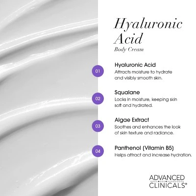 This Hyaluronic Acid Body Cream, infused with Squalane, Algae, and Vitamin B5, nourishes and replenishes moisture. It helps lock in hydration, leaving skin visibly plumper, smoother, and more radiant looking. This rich, velvety formula absorbs easily for an enhanced soft and supple appearance.How To UseApply to dry or damp skin, massaging until fully absorbed.Tip: For enhanced hydration, apply to damp skin. The hyaluronic acid helps attract and lock in moisture for deeper hydration.Designed with a twist-off cap to access to every last drop—minimizing waste!IngredientsHyaluronic Acid: A humectant that attracts and retains moisture to skin for hydration.Squalane: Derived from sugar cane, lightweight emollient that helps lock in essential moisture and nourishes skin, keeping it soft & hydrated.Algae Extract: Visibly enhances skin texture, improves the look of fine lines, boosting natural radiance.Panthenol (Vitamin B5): A multifunctional ingredient that helps attract water & increase hydration while giving skin a visibly plumper appearance.