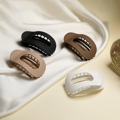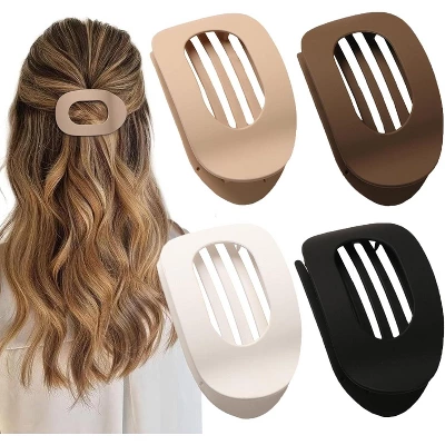 Flaw claw clips for women 1) Large flat claw clips to Hold Thick Hair 2) Flat round hair clips with strong grip 3) Powerful metal spring 4) For various hair type like Low Ponytail/Half-up/Daily Hair 5) Various fashion neutral matte colors: matte black, matte white ,matte beige and matte coffee.