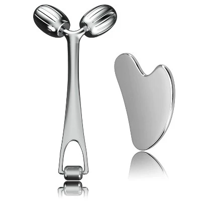 This facial massage set includes a gua sha tool and a roller, made of full stainless steel. It has a solid texture in the hand and delivers a natural cool touch when it comes into contact with the skin, adding a sense of comfort and luxury to daily skincare. The roller is thoughtfully designed: one end is suitable for massaging large areas such as cheeks, arms and legs, while the small roller is precisely fit for the eye area to easily relieve eye fatigue. The gua sha tool glides smoothly without pulling the skin when used with skincare products. Massaging daily in the way of “from bottom to top and from inside to outside” can promote facial blood circulation, help the absorption of skincare products, make the skin smoother and the facial contour clearer. It is a great choice for daily self-care or as a gift for friends.