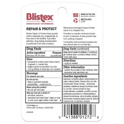 Blistex Repair & Protect Lip Stick provides 12-hour moisture while helping protect lips from dryness and environmental damage. Its medicated formula relieves discomfort from chapped lips and promotes healing. Compact and portable, it’s perfect for carrying in a purse or pocket for convenient, anytime protection.