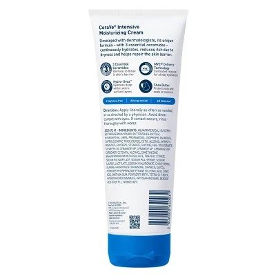 CeraVe Intensive Moisturizing Cream, as its name implies, is an intense hydration cream and our richest moisturizer for dry to very dry skin on either the face or body. Formulated with 5% Hydro-Ureaâ„¢ (a blend of natural moisturizers), shea butter, three essential ceramides, and MVE delivery technology, it helps restore the skin barrier while providing 72-hour hydration and a flake-free, radiant glow. Suitable for all skin types and tones, including sensitive and irritated ones, skin instantly looks and feels more hydrated, smoother, and luminous. With continued twice-daily use, or as directed by a dermatologist, this intense moisturizing cream has been clinically shown to leave skin healthier-looking, softer, and more comfortable in just one week.*