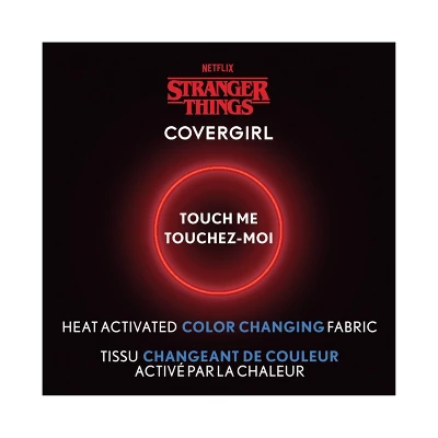 Carry and go cosmetic bag custom-sized to hold the entire COVERGIRL x Stranger Things Limited Edition collection of products. Thermogenic, heat-activated fabric transforms from black to blue when touched.