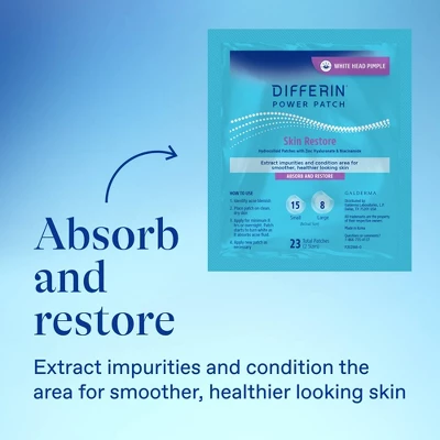 - HYDROCOLLOID PIMPLE PATCHES: One pack of 23 (15 small, 8 large) Differin Power Patch Skin Restore Patches designed to absorb and extract whiteheads and gunk-filled pimples