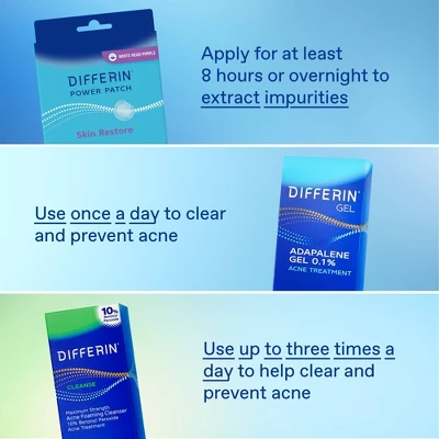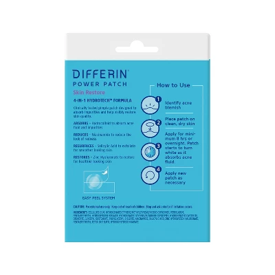 Target white head pimples with Differin Power Patch Skin Restore Pimple Patches. Featuring a 4-in-1 Hydrotech(TM) formula, these hydrocolloid patches absorb and restore the skin by extracting impurities and conditioning the area for smoother, healthier looking skin. With zinc hyaluronate to help retain moisture and niacinamide to help improve skin tone and texture and reduce the look of redness. Salicylic acid gently exfoliates while the hydrocolloid layer creates a barrier to help promote clearer skin. These clinically tested patches are safe for all skin types, including acne-prone and sensitive skin. Each box comes with 23 clear patches in two different sizes (15 small and 8 large) for discreet, versatile blemish coverage for zits, white heads, blackheads and more. After cleaning and drying the area, place patch on a pimple. Leave each acne patch on for a minimum of 8 hours or overnight, remove and discard. Reapply a new pimple patch, as necessary.