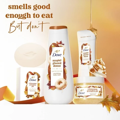 - IRRESISTIBLE FESTIVE SCENTS: Fall into the warm embrace of the scent of warm maple glaze on a freshly baked donut. Savor the delightful scent of sweet creaminess as you pamper your skin with Dove’s Holiday Treat Body Wash.