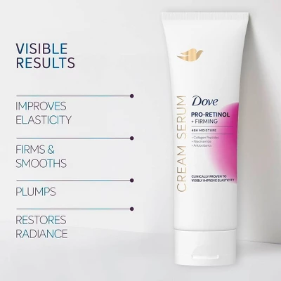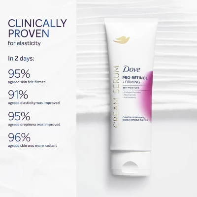 - SCIENCE-BACKED: Dove Cream Serums are clinically tested for efficacy and safety for all skin types and tailored to include powerful ingredients scientifically evidenced to provide visible benefits to skin.