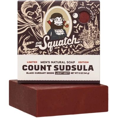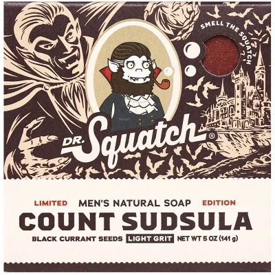 Lather up for a blood-curdling shower with Count Sudsula. Sink your fangs into a dark scent of berries, leather, and vetiver. With exfoliating Black Currant Seeds and Resurrection Plant, this haunting lather leaves skin fresh and revived. Unlike those synthetic bodywashes packed with harsh chemicals, Dr. Squatch Natural Soap will leave you feeling fresh, clean and smelling like a champion! We craft our natural soap with a traditional cold process and use only the finest natural ingredients like Coconut Oil, Shea Butter, and Kaolin Clay.