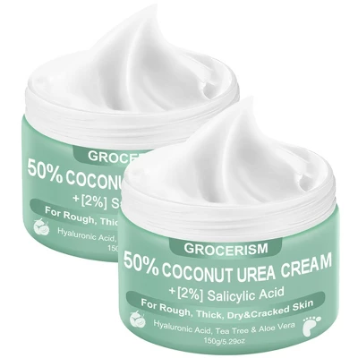 Coconut-Powered Repair Grocerism 50% Coconut Urea Cream blends 50% urea and 2% salicylic acid to target calluses, cracks, and dryness—ideal for restoring smoothness to hands, feet, heels, and rough areas.