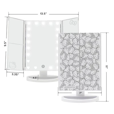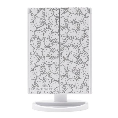 Impressions Vanity Hello Kitty LED Tri Tone Makeup Mirror features a timeless style. Long-lasting LED lighting is key to achieving a classic, yet sophisticated look. Tap the Power button to power it on/off and press and hold the Dimmer button to adjust the brightness to your desired level. Tap the Lighting button to switch between natural, warm, or cool lighting. Your makeup routine just got so much cuter with the Hello Kitty Trifold LED Makeup Mirror with Magnification. Catch every detail with three mirror panels easily adjustable to your unique makeup lighting needs in our travel mirror with lights. Heart shaped LED lighting with improved brightness, Front facing soft touch sensor switch with dimming function. Simply tap to turn it on and off or hold it down to dim or brighten, Three adjustable mirror panels including magnified close up mirrors
