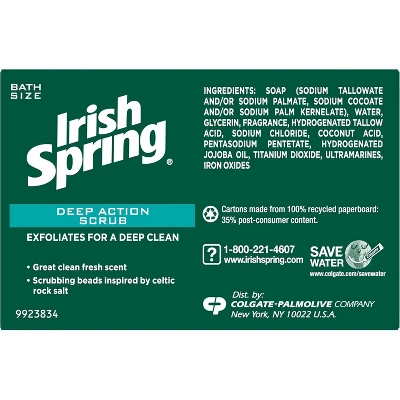 Irish Spring Deep Action Scrub Deodorant Soap combines the classic invigorating scent of Irish Spring with exfoliating micro-scrub beads for a deep clean and effective odor control. Each 3.7 ounce bar contains biodegradable exfoliants that slough away dead skin cells and unclog pores, while antimicrobial agents help eliminate odor-causing bacteria. The 3-bar pack ensures you always have a fresh scrubbing bar on hand. Ideal for rough skin prone to oiliness or post-workout freshness, this bar energizes the senses and leaves skin smooth, refreshed, and confidently deodorized.