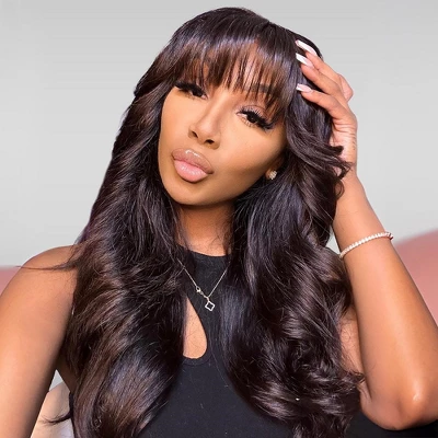 About this item1. Glueless wig material: glueless human hair wig with bangs human hair full cuticle aligned. Can be restyled as your own hair. No tangle and shedding. Unprocessed natural black color take color and hold curls well.2. Upgrade wig cap: Body wave 13×5 lace front wig human hair new bulid-in elastic wig cap. Fasten your side lace to ensure wig stays in place all day long. Wide elastic band and adjustable straps easy install and fit 22-22.5 inches head.3. Ready to wear pre everything wig design: Glueless human hair wigs with bangs ready to wear design, pre-cut, pre-bleached knots, pre-plucked. Just put it on and go, saving time and without the mess and fuss of glues and adhesives.4.Natural look: Lace front wig human hair bangs design with big 13×5 lace on top. This enhancement makes the wig appear more natural compared to non lace front wigs. The lace blends seamlessly with various skin tones, ensuring an undetectable hairline.