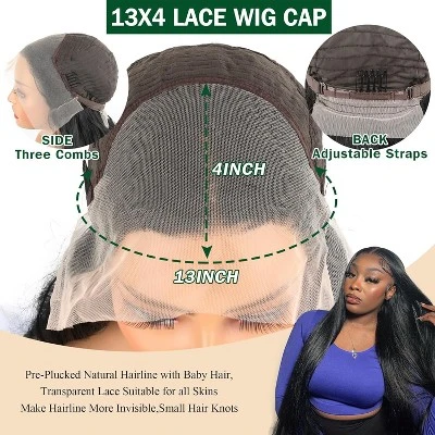 About this itemStraight Glueless Human Hair Wigs : Easy Wear, No Glue Needed , Natural Look & Comfortable Fit, Fashionable & Effortless Style ,Premium Quality, Comfortable FitWigs:13X4 Straight Glueless Lace Closure Wigs, 100% Unprocessed Human Hair , Pre Cut Lace Glueless Wig,Natural Look And Feel, Comfortable Wear, Ease Of Use, Glueless Wigs Are Easy To Put On And Take Off, Making Them Convenient For Daily UsWigs Advantages:13X4 Straight Lace Closure Wigs Are Designed To Be Worn Without Glue, Reducing The Risk Of Irritation And Discomfort Associated With Adhesive Products. Glueless Human Hair Wigs For Women Natural, Soft, And ComfortableWigs Cap : 13X4 Closure Wigs Cap Construction Of Glueless Wigs Often Allows For Better Airflow, Which Can Help Keep Your Scalp Cool And Comfortable, Especially During Warmer Weather. Head Circumference 22”-22.5” , No Comb, More Comfortable. Adjustable Elastic Band To Suitable For Different Head Sizes Natural Look & Comfortable FitNatural Hairline: Straight Glueless Wigs Pre Cut Pre Plucked Hairlines And Baby Hairs, Enhancing The Natural Appearance And Making The Wig Look Even More Realistic.