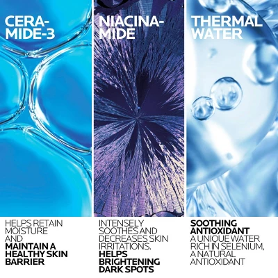 La Roche-Posay Thermal Spring Water: A soothing water sourced in the town of La Roche-Posay in France and a core ingredient in most of our products. It contains a unique combination of minerals, trace elements, and a high concentration of selenium, a natural antioxidant.