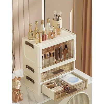 Our Foldable Large Capacity Cosmetics Storage Cabinet is an innovative solution to eliminate cluttered vanities and desktops, blending elegant aesthetics with practical functionality for modern users. Boasting large capacity, multiple transparent drawers, and a space-saving foldable design, it is not only ideal for storing cosmetics and skincare products but also perfect for organizing documents, books, and other daily essentials—effortlessly keeping your space tidy and items easily accessible.