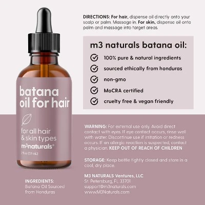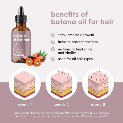 M3’s pure Batana Oil for growth helps provide lost moisture to both skin and hair. Our vegan Batana Oil is carefully formulated to support collagen production and help reduce breakage and split ends. Embrace a more youthful glow and bouncier, stronger hair! Batana Oil helps stimulate the scalp and strengthen hair follicles to avoid breakage and split ends while bringing out your hair’s shine. Skip product buildup and switch to a hair oil for effortless luster! Don’t be afraid to use your Batana Oil aside from your hair. Our unrefined Batana Oil is formulated with the essential building blocks for soft, smooth skin. Go ahead and use on any dry area of your skin—it is generally safe to use on the face, elbows and knees! Our Batana Oil from Honduras is rich in fatty acids and vitamins and is derived from pure & unrefined kernels of the American Oil Palm. Relish all the beauty benefits of our Batana Oil and rest assured that each bottle is free from hexane, parabens, fragrances, and allergens. M3 prides itself in using premium, pure and unrefined ingredients that are sustainably sourced to ensure purity and make sure that no chemicals and additives are included throughout the process of making your Beauty & Wellness Optimizer.