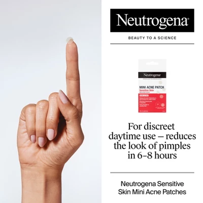 Shink the look of blemishes in just 6-8 hours with Neutrogena Sensitive Skin Mini Acne Patches. Designed for sensitive skin, these hydrocolloid patches from Neutrogena, a dermatologist recom-mended brand, create an optimal healing environment that works to help visibly reduce the size of blemishes, make mature pimples appear smaller, and absorb gunk and impurities from the skin. Designed for smaller breakout areas, these non-medicated, peel-off patches are gentle on the skin and suitable for all skin types, including sensitive skin. To use, cleanse, and fully dry the skin. Remove the backing of the patch and place directly on to the acne blemish. The facial patch starts to turn white after it absorbs fluid; peel off when the hydrocolloid patch turns white or after 6-8 hour of application. Avoid using other topical skincare products before application, use moisturizer after facial patch is applied.