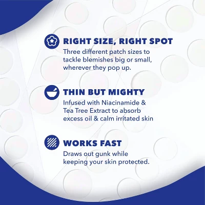 - TARGETED BLEMISH CARE WITH NIACINAMIDE – Formulated with niacinamide and tea tree extract, these clear acne patches are designed to help visibly reduce oil, minimize the look of blemishes, and support clearer skin.