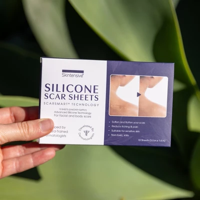 Achieve smoother, softer skin with Skintensive Silicone Scar Sheets, developed by Harvard-trained, board-certified dermatologists. These advanced ScarSmart® Technology sheets are made from 100% medical-grade pure silicone, designed to effectively address various scar types, including old and new scars, keloids, surgical scars, injury and burn scars, C-section scars, and cosmetic-surgery scars. The premium bioadhesive gel formulation ensures strong adhesion, controlled release, optimal absorption, and high stability. Suitable for sensitive skin, these nontoxic, colorless and odorless sheets do not stain clothing and are easy to apply. Simply clean and dry the scar area, cut the sheet to size and apply. For added security, cover with an adhesive bandage.