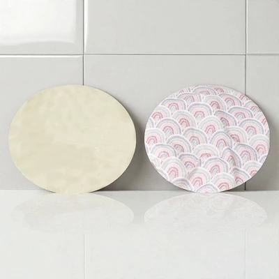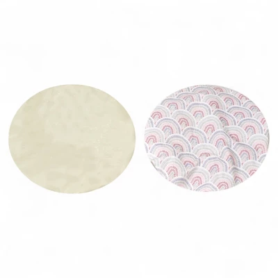 - 2-Pack Variety Set – Includes one solid-color cap (cream or pink) and one patterned cap (rainbow scallops or geometric diamonds) for versatile use.