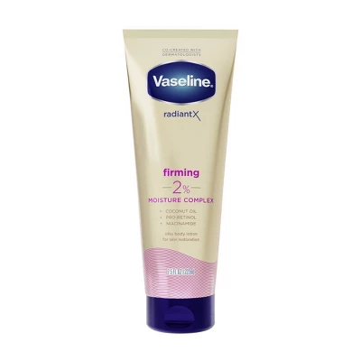 Vaseline Radiant X Firming Body Lotion features the skin-loving ingredients you need to hydrate, plump, and moisturize your skin, making it feel firmer in just two weeks. Powered by our 2% Moisture Firming Complex, a blend of pro-retinol, niacinamide, and petroleum jelly, plus coconut oil and ultra-hydrating lipids, this body lotion is clinically proven to restore your skin’s natural radiance. Co-created with dermatologists, this fast-absorbing lotion provides 72 hours of moisture, is non-comedogenic, safe for sensitive skin, and free from phthalates and parabens. Make Vaseline Radiant X Firming Body Lotion part of your daily skin care routine for glowing, radiant skin. Simply massage it generously all over your body for immediate hydration without feeling greasy or sticky. Vaseline combined 150 years of its skin health expertise with the knowledge of dermatologists specializing in all skin types and tones to create Vaseline Radiant X, a clinically proven skincare range designed to restore your skin’s natural radiance. When searching for the best body lotions that target specific skin concerns, explore our other Vaseline Radiant X products, such as Vaseline Radiant X Even Tone Nourishing Body Lotion, Vaseline Radiant X Deep Nourishment Hand Butter, Vaseline Radiant X Deep Nourishment Body Cream, and Vaseline Radiant X Replenishing Hydrating Body Oil.